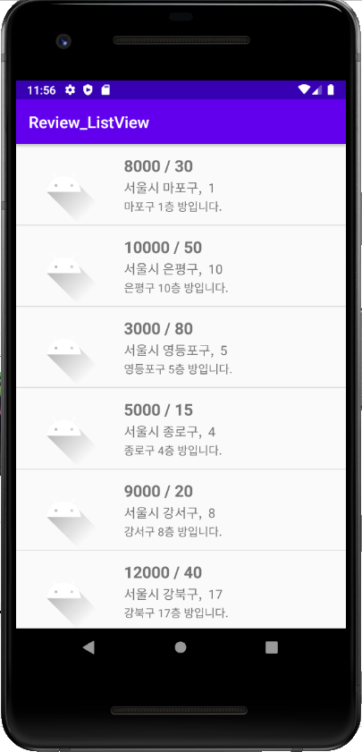 - ListAdapter 다음과 같이 고치기 -> 리스트의 한 칸(아이템)에 들어갈 데이터를 실제 뷰에 적용