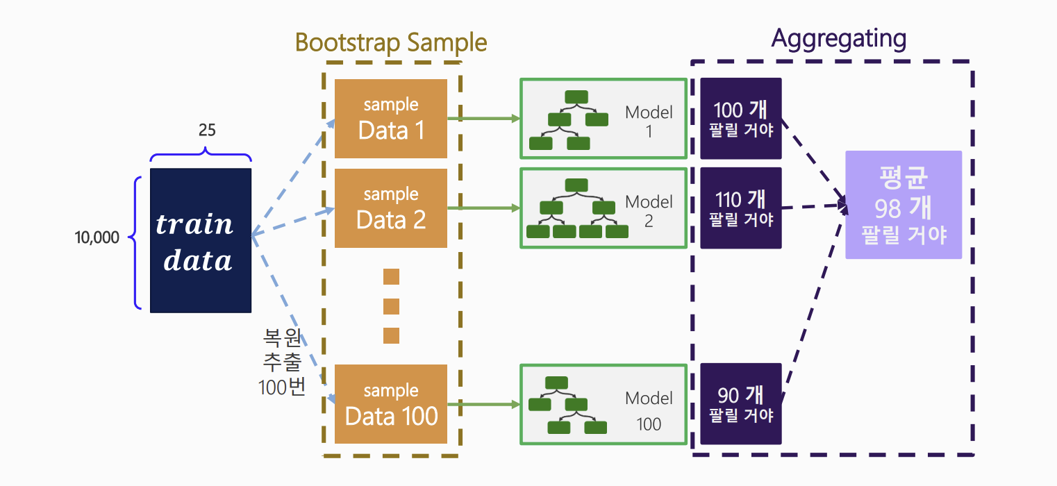 - 전체 학습 데이터에서 복원 추출(Bootstrap)로 여럭 개의 서브 데이터셋 생성