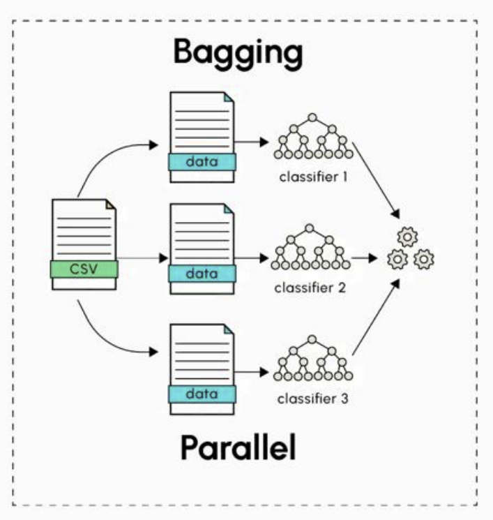 - Bagging: 여러 개의 동일한 모델(혹은 learner)를 서로 다른 데이터 샘플로 병렬 학습 후 예측 결과를 평균/투표로 결합