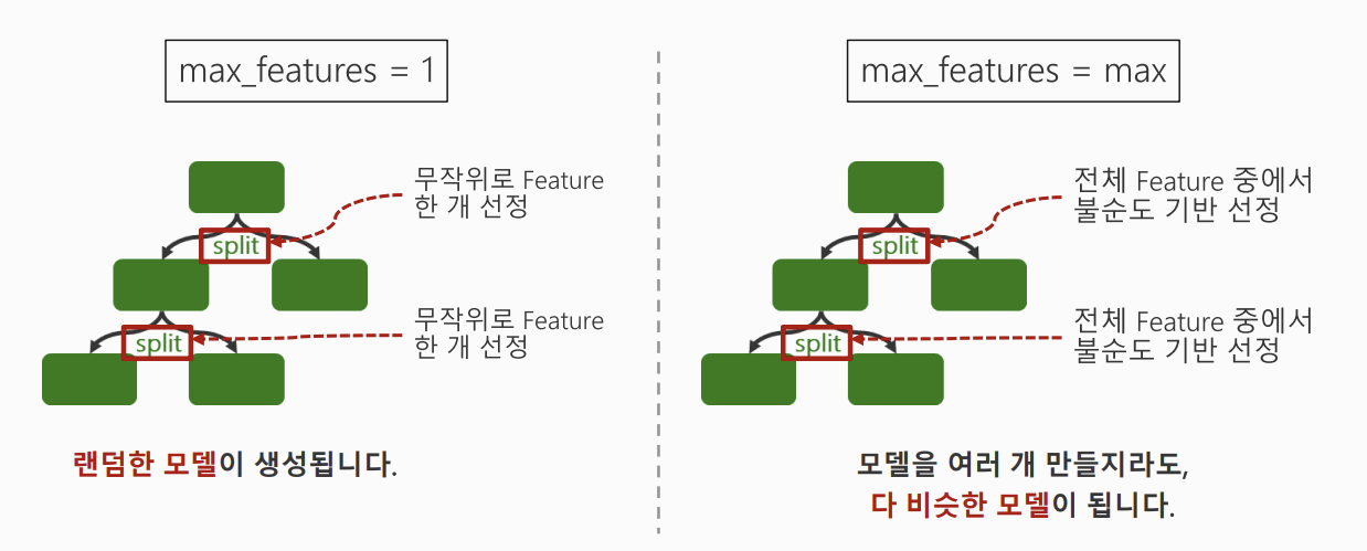 max_feature=1: 랜덤한 모델이 생성 → 트리 간 차이가 너무 커져 예측이 불안정해질 수 있음max_feature=max: 전체 모델에서 랜덤하게 뽑기 때문에 다 비슷한 모델이 생성됨 → random Forest 만든 이유가 없어짐
