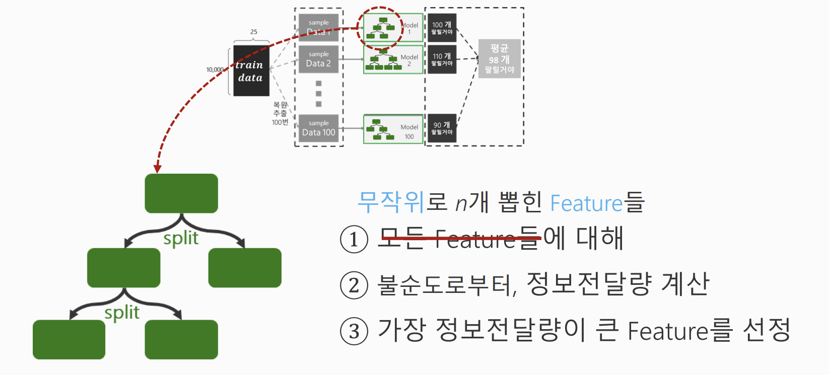 - 이러한 샘플링을 100회 반복하여 100개의 서로 다은 학습 데이터셋 생성