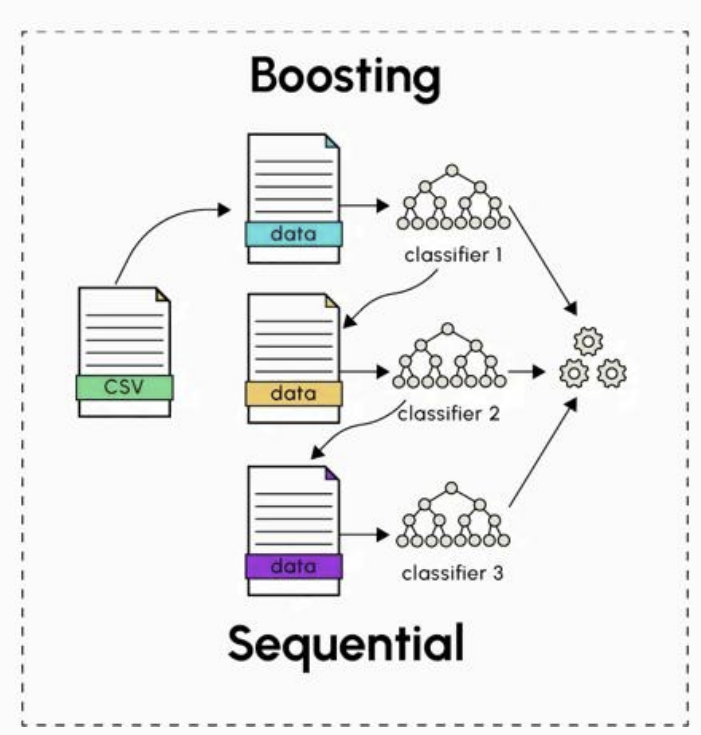 - Boosting: 모델을 순차적으로 학습. 이전 모델이 틀린 예측에 가중치를 주어 다음 모델이 보완하도록 학습하며, 최종 예측은 모두 합쳐서 결정