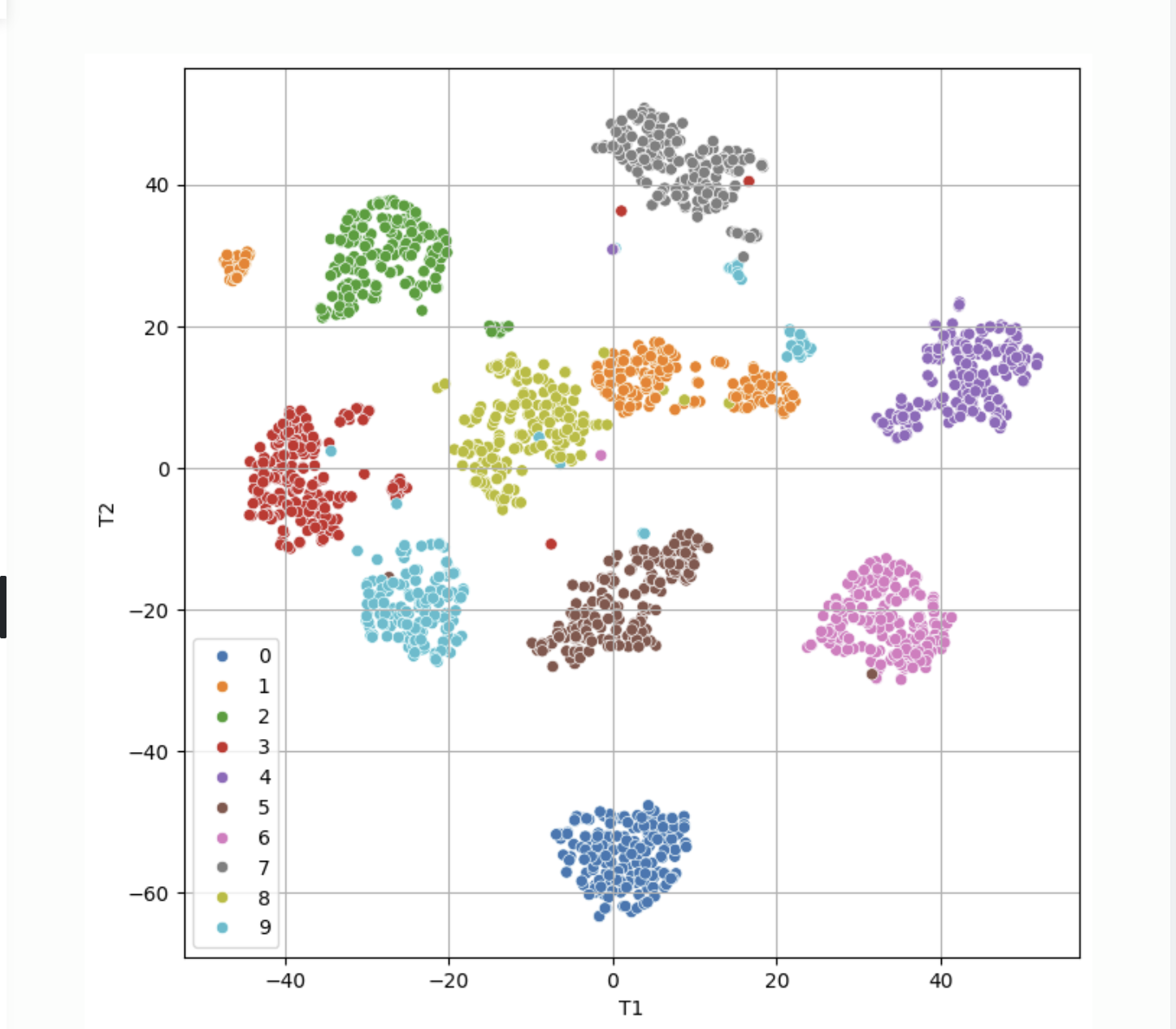 x_tsne = pd.DataFrame(x_tsne, columns = ['T1','T2'])