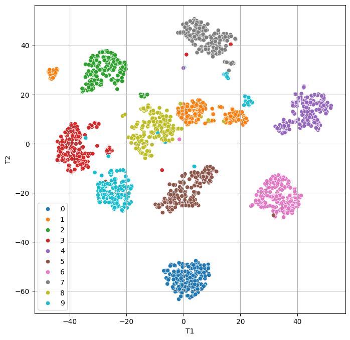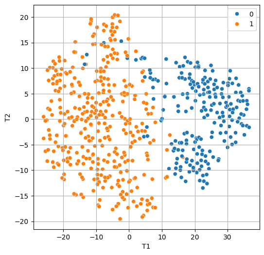 x_tsne = pd.DataFrame(x_tsne, columns = ['T1', 'T2'])