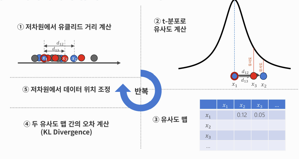 - 원본 데이터으 유사도 맵 생성 → 고차원 공간에서의 이웃 관계를 확률 분포 형태로 표현