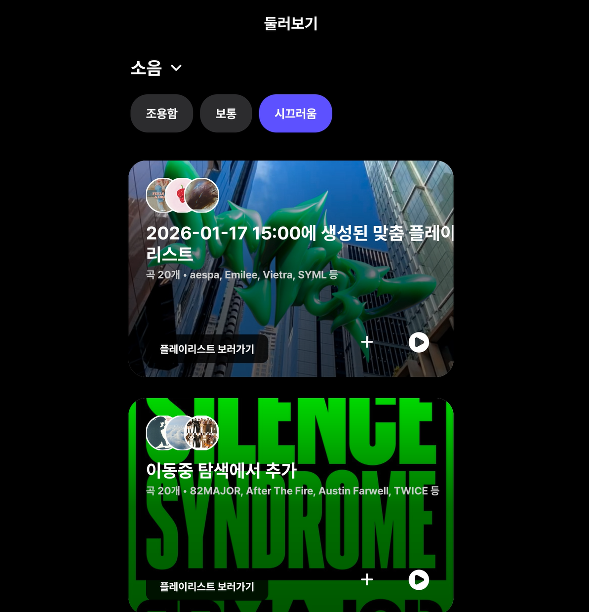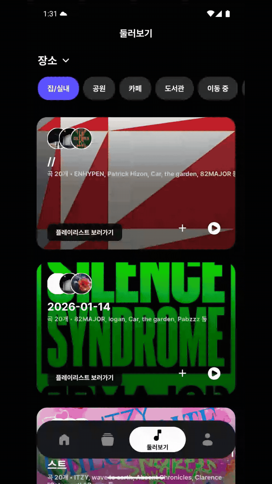 둘러보기란 다른 사용자들이 생성한 플레이리스트를 탐색할 수 있는 페이지이다. 사용ㅈ는 다양한 맥락에서 만들어진 플레이리스트를 살펴보며 새로운 음악 취향을 발견할 수 있다.