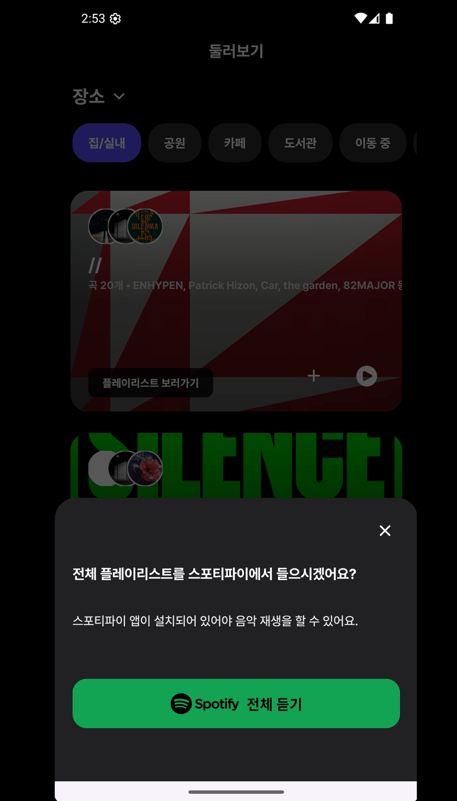 | 둘러보기 페이지 | 스포티파이로 재생하기 |