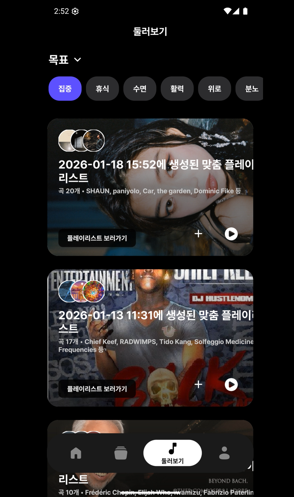 또한 둘러보기 중 맘에 드는 플레이리스트를 발견하면 Spotify 딥링크를 통해 바로 재생할 수 있으며, 내 라이브러리레 저장할 수 있는 기능도 있다.