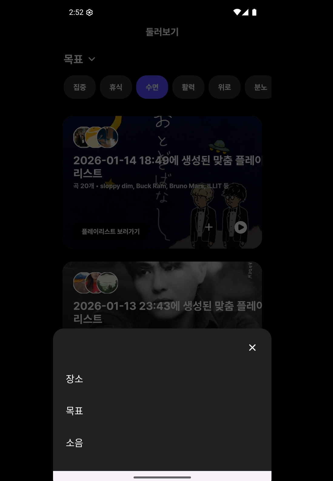 사용자는 이 카테고리를 선택하여 원하는 상황에 맞는 플레이리스트를 탐색할 수 있으며, 각 카테고리 안에서도 세부 필터를 통해 플레이리스트를 좁혀볼 수 있다.