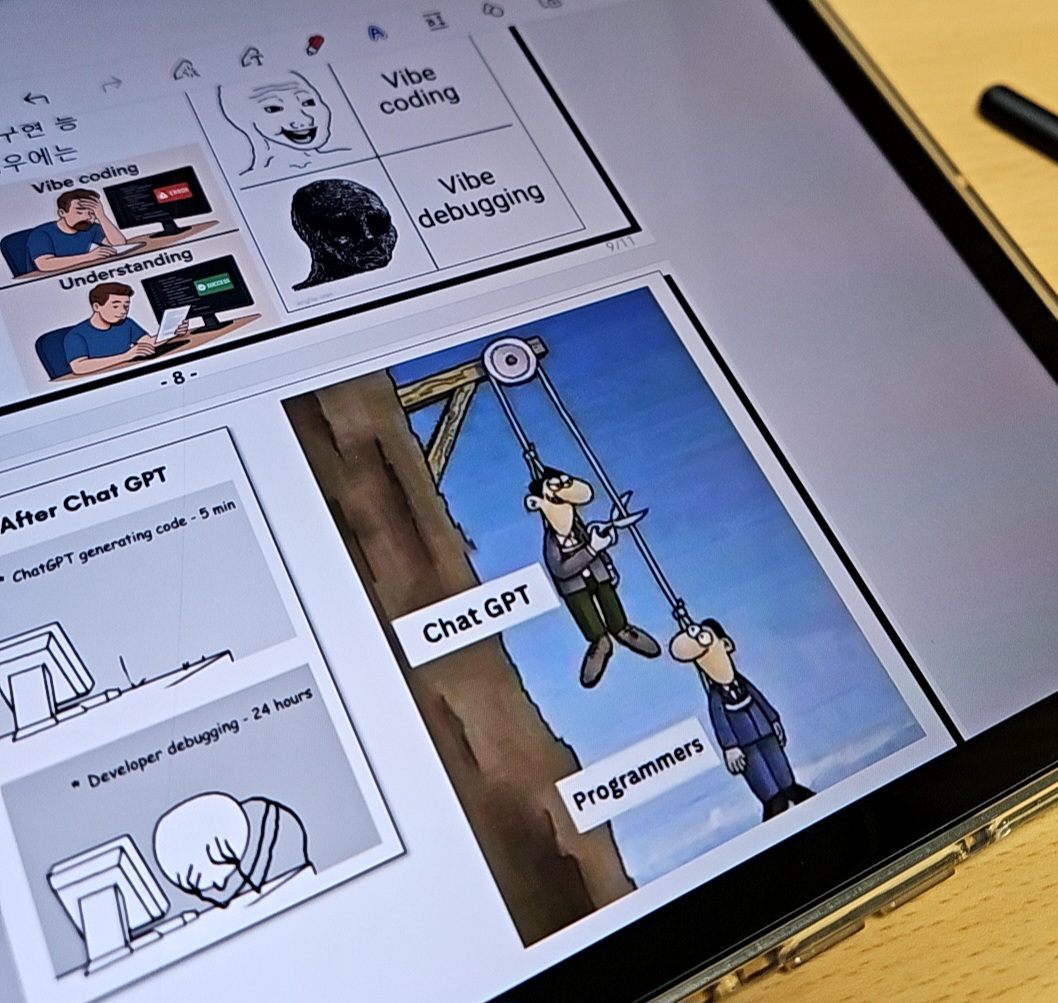 그래서 단순한 코드 작성처럼 AI가 이미 잘하는 걸 파고드는 건 위험하다. 그보다는 AI를 활용해서 전체 매커니즘을 설계하고 관리하는 쪽, 즉 AI 생태계 안에서 방향을 잡는 사람이 진짜 가치를 가져가는 구조가 될 것이라고 하셨다.