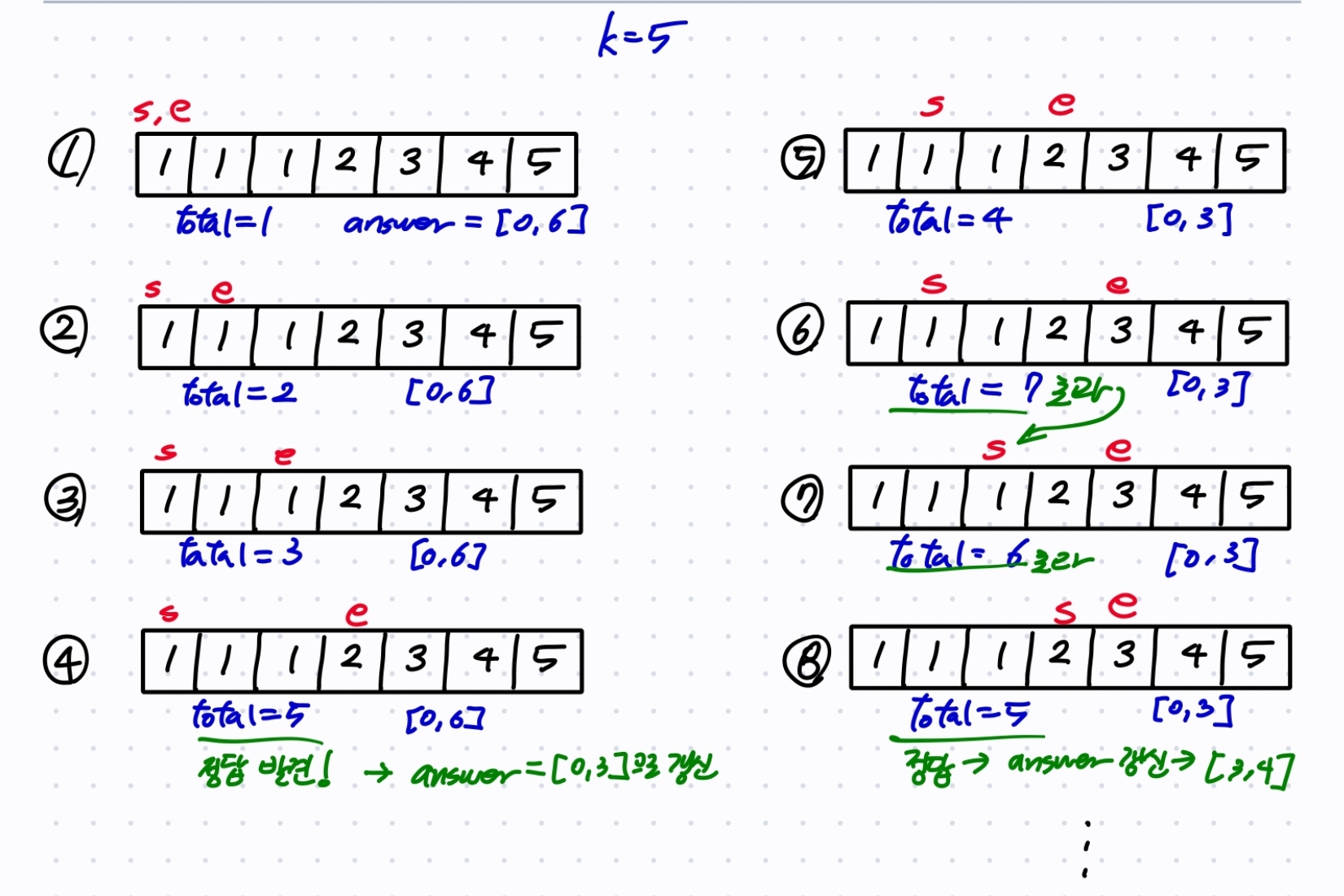 total < k: 합이 부족하므로 ei를 증가한다.total > k: 합이 초과했으므로 si가 가리키는 값을 빼고 si를 증가시킨다.total == k: 더 짧은 수열인지 판단 후 갱신하고, si를 늘려 탐색을 계속한다.
